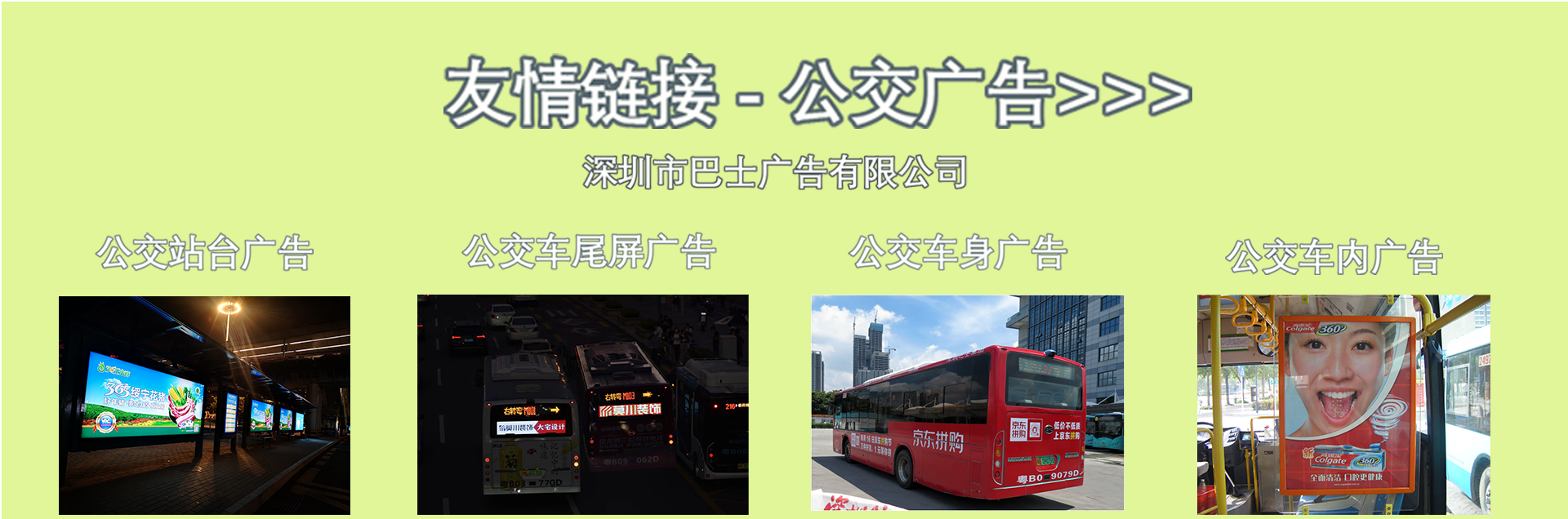 深圳戶外廣告媒體簡介 深圳東、西部公交車身廣告 深圳高鐵廣告 深圳高速收費站廣告 深圳電梯廣告 深圳戶外LED廣告 深圳社區燈箱廣告 深圳出租車尾貼廣告 深圳道閘廣告 深圳門禁廣告 深圳山姆會員店廣告 深圳戶外大牌廣告 深圳地鐵3.6.10.12.14.16號線廣告 深圳地鐵1.2.5.7.9.11號線廣告 深圳地鐵拉手廣告 深圳地鐵移動電視廣告 深圳地鐵出入口媒體廣告 友情鏈接 - 巴士公交廣告>>>